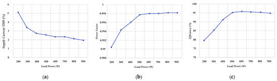 Performance of the presented rectifier under wide power conditions based on simulation: (a) supply current THD versus power curve; (b) operating power factor versus power curve; (c) efficiency versus power curve.