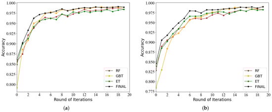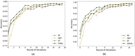 - To verify that SSEAL is more robust than a single classifier, we compare SSEAL with a single classifier. This work observes an accuracy trend of SSEAL and single classifiers as the number of iterations increases. The single classifiers includes Random Forest, GBT and Extra Trees. There is no difference in the sampling strategy between SSEAL and base classifiers except that the base classifier only uses its own queue to filter low-confidence samples and high-confidence samples.