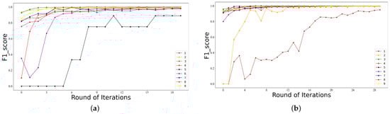 In this experiment, the ability of SSEAL to detect unknown malware is evaluated. As shown in Figure 6, SSEAL can achieve a good detection effect on the samples with a relatively large proportion. The detected F1-score gradually converges to 1. For malware of the fourth and sixth categories, which have very few samples, SSEAL can quickly filter out these rare attack samples. The detection rate of the fifth category samples is completely undetected in the beginning, but it can be found in the sixth round. As the iterations increase, the detection ability of SSEAL for this malware improves rapidly.