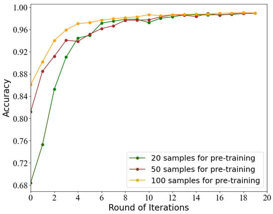 This experiment evaluates the influence of the pre-training dataset to SSEAL. This work pre-trains SSEAL with 20, 50, and 100 labeled samples, and records the accuracy of SSEAL in each iteration. As shown in Figure 8, the influence of the pre-training data to SSEAL is obvious. When there are fewer pre-training samples, the initial accuracy of SSEAL is lower.