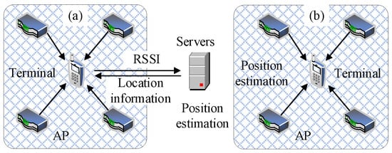 Basic architecture of RSSI-based positioning. (a) The data is received on the mobile terminal and the external server performs position estimation; (b) Complete data reception and position estimation on mobile terminal.