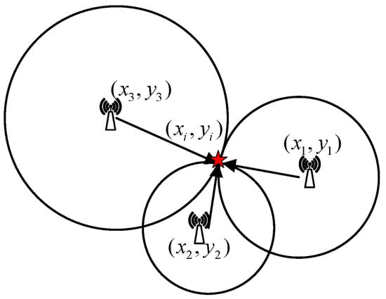 Figure 4 shows the schematic diagram of trilateral positioning [29]. Known (x1, y1), (x2, y2), (x3, y3) coordinates of three points and (xi, yi) to their distance were d1, d2, d3. According to the Euler distance calculation method, the equations shown in 11 can be listed, and then the coordinates (xi, yi) can be obtained by solving the equations. In [30], the RSSI signal of BLE is used to adopt trilateral positioning and mean filtering to design and develop an Android application for positioning navigation, which can be used in libraries to help visitors quickly find the position of the shelf where the desired book is located.