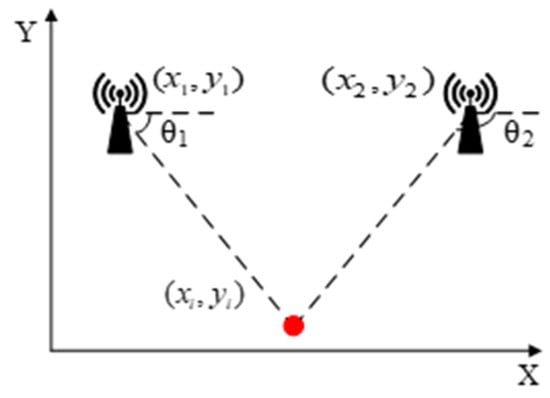 The triangulation positioning method utilizes the geometric properties of triangles to position the target and estimate the unknown point coordinates by acquiring the angle between the position node and the given AP via the sensor [24]. Figure 5 shows the principal diagram of triangulation. It is known that the coordinates of AP1 and AP2 are (x1, y1) and (x2, y2), the equations shown in Equation (12) can be listed according to the geometric relationship, then the coordinates of the position nodes can be solved by Equation (12).