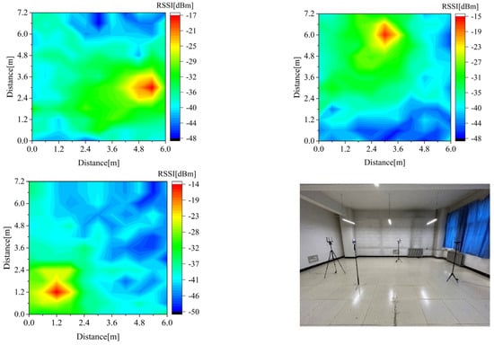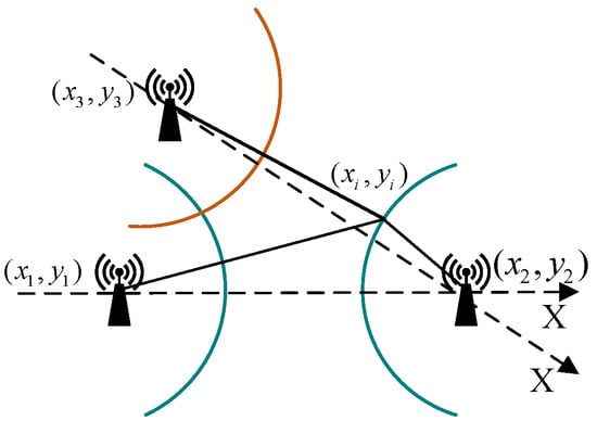 In Equation (11), the distance from to the three points can be established by modeling between RSSI and distance.