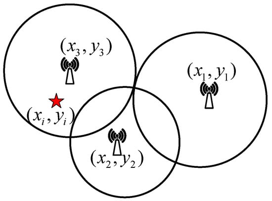 Figure 7 shows the principal diagram of the approximation of positioning. Let the corresponding position coordinates of three APs be known as (x1, y1), (x2, y2) and (x3, y3) respectively, and the unknown point be (xi, yi). According to the approximation, it is judged which AP (xi, yi) is within the coverage of, then the coordinates of the unknown point are considered to be approximated as the position of the coordinate point of that AP [34]. The schematic diagram of the approximation positioning is shown in Figure 7.