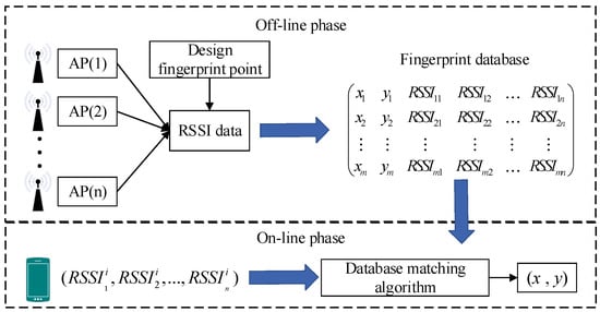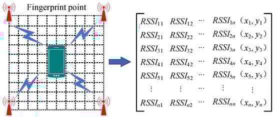 Fingerprint positioning methods can be generally divided into offline and online stages. The offline stage is used to establish a fingerprint map/database [35], and the online stage is the positioning stage, namely, measurement and matching. The positioning area is artificially set up with grid points and the RSSI values corresponding to different WI-FI are measured for each point, i.e., Equation (14) is obtained. After all points are measured, the fingerprint matrix as shown in Equation (15) is obtained. This process is called the fingerprint database establishment.