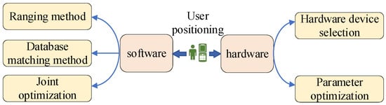 The optimization methods for wireless positioning technology can be divided into software optimization and hardware optimization. Figure 9 shows the common wireless positioning optimization method diagram. Hardware optimization commonly includes hardware device selection and parameter optimization, while software optimization methods are mainly related to algorithm optimization, including distance measurement method optimization, database matching method optimization, combination optimization methods, etc.