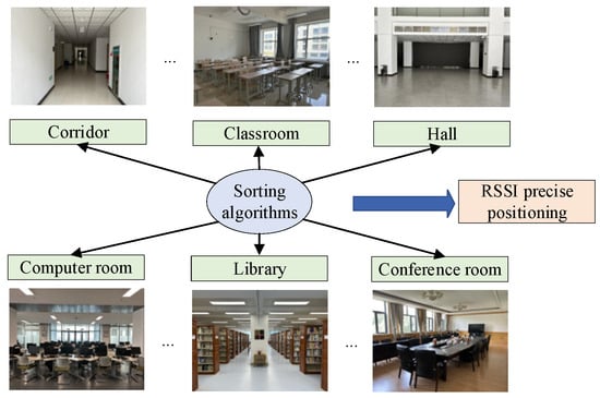 With the rapid development of artificial intelligence and information technology, location-based services have become one of the basic needs of people’s daily life [1]. As a mature positioning technology in an outdoor environment, the Global Navigation Satellite System (GNSS) has achieved sub-meter positioning accuracy, which can provide more accurate positioning services [2]. However, GNSS and the Global Positioning System (GPS) are still unable to obtain accurate positions in an indoor environment [3]. At the same time, people’s increasingly frequent indoor activities create a stronger demand for wireless positioning technology [4]. Different from the outdoor environment, indoor signal is severely attenuated due to factors such as occlusion, which is not conducive to achieving more accurate positioning [5]. Therefore, wireless positioning using ultrasonic, WIFI, Bluetooth, radio frequency identification, infrared and other technologies has gradually become the focus of attention [6]. As a common measurement index, RSSI can realize positioning without additional measurement means, such as laser, camera, magnetic, ultrasonic acoustic sensor or lidar [7], thus reducing positioning cost and energy consumption [8]. However, the original RSSI signal from the wireless access point is susceptible to obstacles, signal fluctuations, noise, environmental changes, non-line-of-sight communication, multipath interference, etc. [9,10,11].