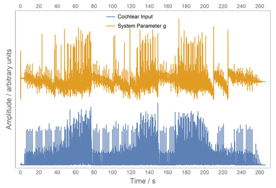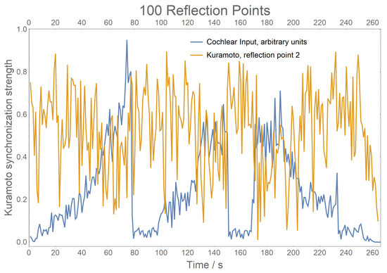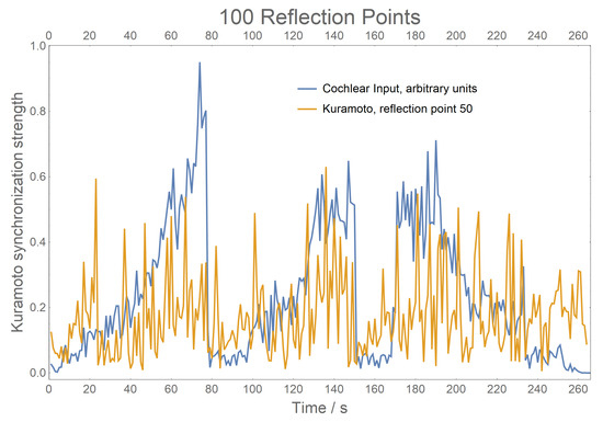 As an example of the correspondence between and in Figure 3, the time series of and , so at 50 Hz for the N = 100 case, is shown. Clearly, synchronization follows the amplitude of the cochlea input, the musical piece, nicely. The synchronization is not as smooth as found experimentally; however, the model is only about listening to this musical piece while the EEG experimental data measure the whole brain performing many other tasks at the same time.