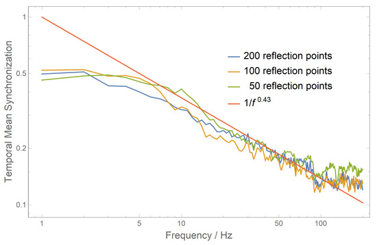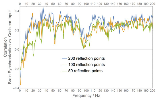 Figure 2 shows , the correlation of the Kuramoto order parameter with cochlea input for frequencies up to 200 Hz for the three reflection points N = 50, N = 100, and N = 200. As expected, there is a peak in around 50 Hz, with decreasing correlation both above 50 Hz, up to about 90–100 Hz, and below 50 Hz. This is consistent over N = 50, 100, and 200, again pointing to the independence of the choice of N. Still, the correlation for N = 50 is slightly lower than for N = 100 and N = 200, a tendency already found above.