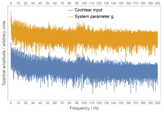 Spectra of the cochlea input and the system parameter g for N = 100. Peaks are present at about 50 Hz and 100 Hz. Strong amplitudes at very low frequencies point to the rhythm content of the musical piece.