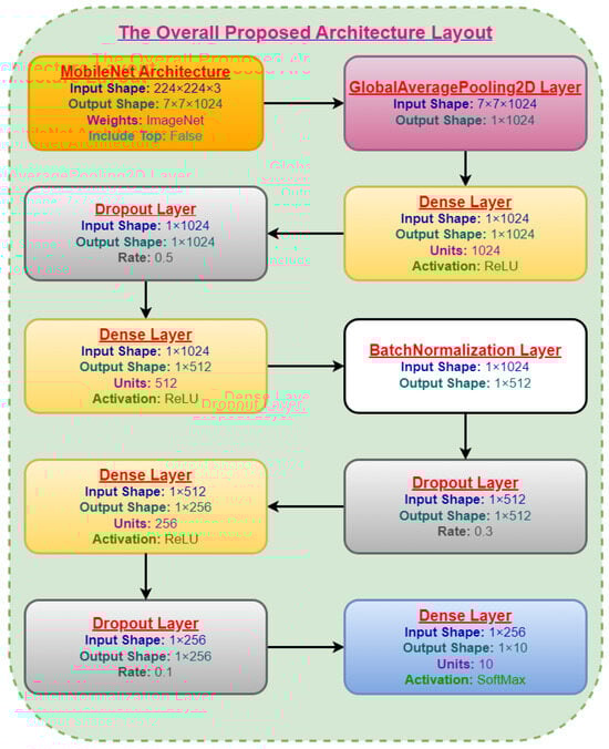 As shown in Figure 1, the proposed architecture starts with the MobileNet model as a backbone to perform the feature extraction process by taking RGB images as input of size (224 × 224 × 3) and extracting features as an output of size (7 × 7 × 1024). Then, the global average pooling layer converts the extracted features into a size of (1 × 1024) by making an averaging process per each extracted feature channel. Hereby, the dense layer with 1024 units and ReLU activation function is inserted, followed by a dropout layer with a rate value of 0.5. Therefore, a new dense layer with 512 units and a ReLU activation function is added, followed by a batch normalization layer and a dropout layer with a rate value of 0.3. Furthermore, a further 256 units of a dense layer with a ReLU activation function are appended, followed by a dropout layer with a rate value of 0.1.