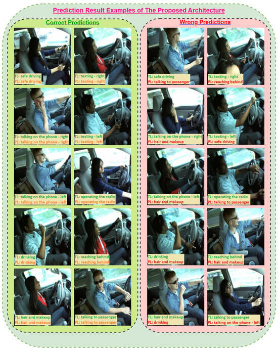 Examples of the correct and incorrect prediction results of the proposed architecture for the ten human driver conditions according to the State-Farm dataset, in which the TL is the true label and the PL is the predicted label.