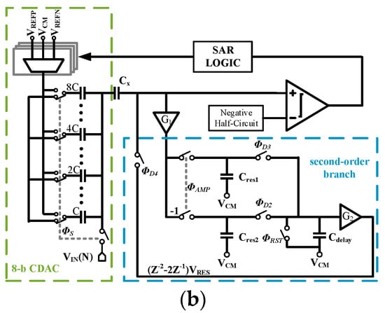 - Guo, W.; Sun, N. A 12b-ENOB 61µW noise-shaping SAR ADC with a passive integrator. In Proceedings of the ESSCIRC Conference 2016: 42nd European Solid-State Circuits Conference, Lausanne, Switzerland, 12–15 September 2016; pp. 405–408. [Google Scholar]