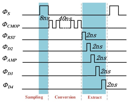The proposed second-order noise-shaping sequence is depicted in Figure 2. During the sampling phase ΦS, the input signal is transmitted to the CDAC top plate via the sampling switch. After eight cycles of operation by the comparator, the residual voltage Vres is present on the CDAC top plate. Prior to the next sampling phase, the ΦRST signal resets the potential of Cdelay. Upon activation of ΦD2, charge is shared between Cres2 and Cdelay. Upon deactivation of ΦD2, ΦAMP is activated, causing the dynamic amplifier G1 to amplify the Vres voltage on the CDAC top plate and transmit it to both Cres1 and Cres2. Finally, ΦD3 is activated to facilitate charge sharing between Cres2 and Cdelay. After completing these operations, when the next sampling phase ΦS cycle commences, the dynamic amplifier G2 amplifies the voltage stored on Cdelay and feeds it back to the Cx, achieving second-order noise shaping.