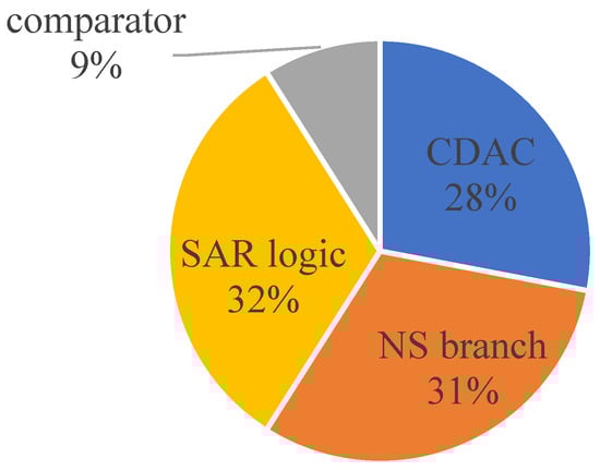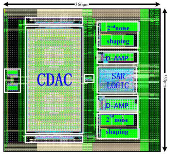 The novel second-order sampling error feedback noise-shaping SAR ADC proposed in this paper has been successfully implemented using TSMC 65 nm technology. The chip design is carried out in the post-simulation stage. It occupies a compact area of 0.122 mm2, as illustrated in Figure 4. After carrying out rigorous post simulations, the total power consumption of the ADC is determined to be 417 μW. The power distribution among different components is as follows: CDAC accounts for 28%, second-order noise-shaping branch for 31%, SAR logic for 32%, and comparator for 9%. Figure 5 illustrates a pie chart depicting the power distribution of the entire noise-shaping ADC. Figure 6 illustrates the impact of capacitor mismatch on second-order noise-shaping effects. The peak represents the input signal energy, and the rest represents the noise energy. Under the interference of mismatch, the signal energy is unchanged and the noise energy is increased. It is evident from the figure that the mismatch in the capacitor array significantly affects the accuracy of the ADC. The main factor restricting the attainment of high precision in the ADC is device mismatch. In the case of a typical SAR ADC, the mismatch error of the DAC restricts the effective number of bits to approximately 12 bits.