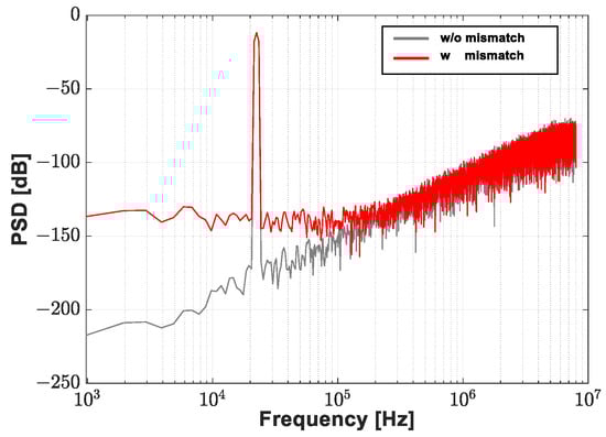The impact of capacitor mismatch. The gray line represents a situation without mismatch, and the red line represents a situation with mismatch.