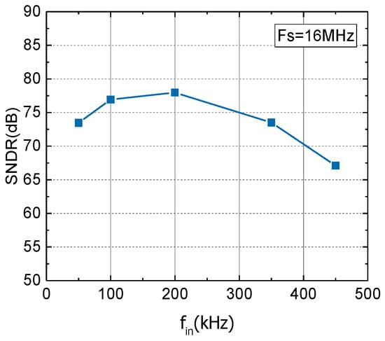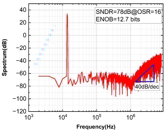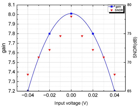 As a result of the utilization of an incomplete dynamic amplifier in the circuit, the amplifier gain will exhibit slight variation across different input voltages. Figure 7 demonstrates that the amplifier gain will range from 7.2 to 8.0 when the input range is -0.04 V to 0.04 V. As can be seen in Figure 7, the gain change in the dynamic amplifier has a great influence on the SNDR of the ADC, and the SNDR is reduced by 10 dB when the error reaches 0.04 V. Figure 8 illustrates the simulated spectrum with a conversion rate of 16 MS/s and an input frequency of 13 kHz. The simulated signal-to-noise-and-distortion ratio (SNDR) is 78 dB when the oversampling rate (OSR) is 16.