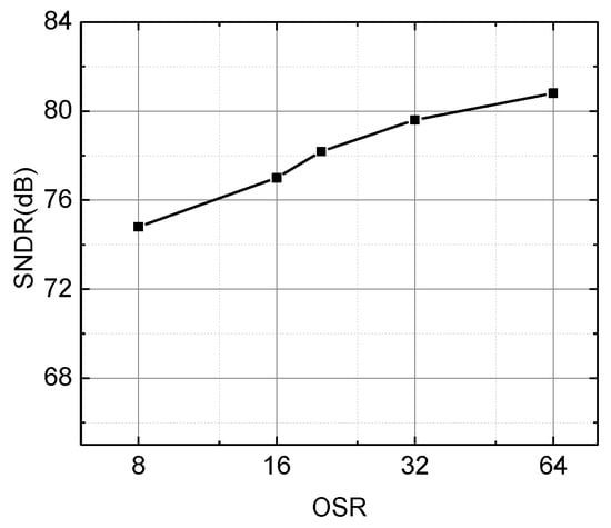 As the input signal frequency, fin, is varied from 50 kHz to 450 kHz, the post-simulation SNDR ranges between 67 dB and 78 dB, as depicted in Figure 9. This second-order noise-shaping SAR ADC, utilizing sampling error feedback, achieves an impressive FoMs of 168 dB. According to the oversampling principle, doubling the OSR will increase the SNDR by 3 dB as in Figure 10, so oversampling can effectively improve the accuracy of the ADC. However, in order to maintain the signal bandwidth, doubling the oversampling rate requires doubling the sampling rate, resulting in doubling the power consumption, so simply using oversampling to improve ADC accuracy is not a highly energy efficient solution.