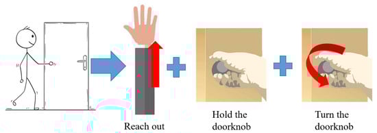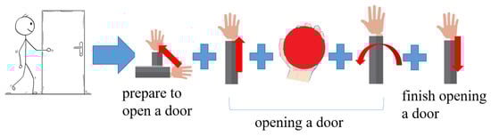 A door-opening action is decomposed into five basic actions according to Figure 11. Raise up label encoding is [0, 0, 1], forward label encoding is [0, 1, 0], hold object label encoding is [4, 0, 0], turn left label encoding is [0, 0, 4], backward label encoding is [0, 2, 0].