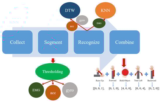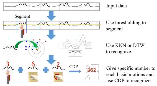 To facilitate this, we initially define a set of basic motions aligned with the axes of our sensors. For example, using a three-axis accelerometer, we can define six fundamental motions corresponding to the sensor’s detection capabilities. The process then involves segmenting the most probable parts of these basic motions from continuous sensor data. We employ a thresholding technique for this segmentation, based on the premise that physical motions generate detectable energy or movement, manifesting as higher sensor values. Finally, to accurately classify these segmented basic motions, we utilize two distinct recognition methods: k-nearest neighbors (KNN) [5] for muscle sensor data, and dynamic time warping (DTW) for accelerometer and gyroscope data. This dual-method approach enables precise identification of the varied basic motions, laying the groundwork for our system’s ability to recognize complex activities. Our research contributes a flexible, scalable, and accurate framework for recognizing a broad spectrum of daily activities. Then, when we obtain the basic motions, we have to combine the sequence of them. Here, we will first give each basic motion which we defined specific numbers to represent them. When we obtain the sequence of basic motions, we will transform the sequence of basic motions into a simple number list according to the numbers that we give. Then, we will use continuous dynamic programming (CDP) to recognize what kind of target motion is combined with these basic motions.