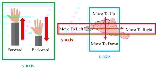 In the context of forearm movement, we have established definitions based on the directional output of the accelerometer, as illustrated in Figure 5. Specifically, the ‘forward’ and ‘backward’ basic motions correlate with the accelerometer’s y-axis. Correspondingly, the ‘move to left’ and ‘move to right’ motions are associated with the x-axis of the sensor. Finally, the ‘move up’ and ‘move down’ motions are defined in relation to the z-axis of the accelerometer. This structured approach allows for precise motion categorization and enhanced interpretability of accelerometer data.
