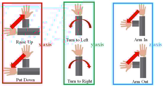For rotation of the forearm, we also define the basic motion according to the gyroscope sensing direction, as shown in Figure 6. “Raise Up” and “Put Down” correspond to gyroscope x sensing direction. “Turn to Left” and “Turn to Right” are for the y-axis. “Arm In” and “Arm Out” are for the z-axis.