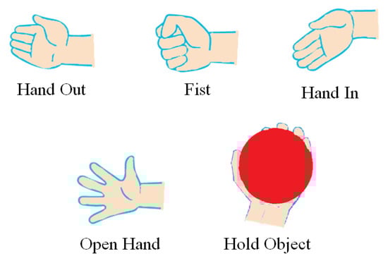 And for the status of the hand, we simply define five kinds of gestures, as Figure 7 shows: “hand out”, “fist”, “hand in”, “open hand”, and “hold object”.