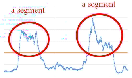 The primary objective of our research is to identify basic motions that form the foundation of most complex movements. This includes all forms of movement, rotation, and hand force exertion. As discussed in the preceding section, we hypothesize that threshold-based segmentation can effectively isolate each candidate of basic motions. Thresholding segmentation, a straightforward method, involves segmenting data based on a predefined threshold value. As illustrated in Figure 8, data exceeding this threshold is segmented and extracted. Accordingly, we apply this thresholding technique for the segmentation of basic motions. For the EMG data, we employ the RMS of the raw data to segment basic motions associated with the user’s gestures, as previously mentioned. The optimal threshold for the RMS of the EMG data was determined through experimental trials, aimed at achieving effective gesture segmentation. In the case of IMU data, we utilize the root sum square of the raw data for segmenting basic motions related to the user’s forearm. The thresholds for the accelerometer and gyroscope data were similarly established through experimentation, with the goal of finding the most effective values for segmenting each type of sensor data.