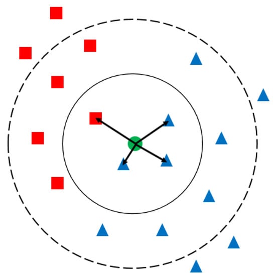 The KNN [28] algorithm serves as a relatively straightforward method for classification. The initial step involves training the KNN model by providing it with feature data and corresponding labels. During the testing phase, feature data are input into the KNN model, which then computes the distances between the input features and the training data. The classification result is determined based on the k-nearest neighbors in relation to the test data, effectively categorizing the gesture. The operational mechanism of the KNN algorithm is visually represented in Figure 9, providing an illustrative overview of its functionality in gesture recognition. Among the three closest points to the green dot, there are more red triangles, so we will classify them into the same category as the red triangles.