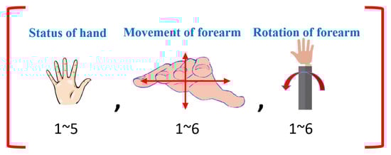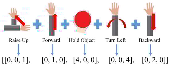 For example, as shown in Figure 12, the basic motion ‘raise up’, which pertains to a type of forearm rotation, is classified as the first type in the rotation category of basic motions. Therefore, it is represented numerically as [0, 0, 1]. This numerical coding system is consistently applied to all basic motions, following a standardized rule for representation, ensuring uniformity and precision in the encoding process.