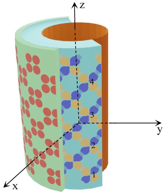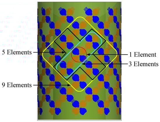 The designed array formed by mutually coupled disk pairs demonstrated broad bandwidth characteristics. It is also bendable to make it deployable on curved surfaces. This array structure was chosen for studying the mutual coupling effect because coupling in this arrangement is essential for the array to obtain broad bandwidth. The cylindrical array is in a dual slant-polarized configuration, and mutual coupling between the elements was significant to yield a low profile. The wideband cylindrical array design is shown in Figure 2. It consists of three layers: one active layer of tightly coupled crossed disks in the middle and one metasurface on the outside, backed up by a ground plane in the core of the cylinder with a smaller radius and hole inside. These three layers are concentric. Four subarray configurations are also illustrated where 1, 3, 5, or 9 elements are included in the subarray, respectively. The cross-section view of the cylindrical array is shown in Figure 3.