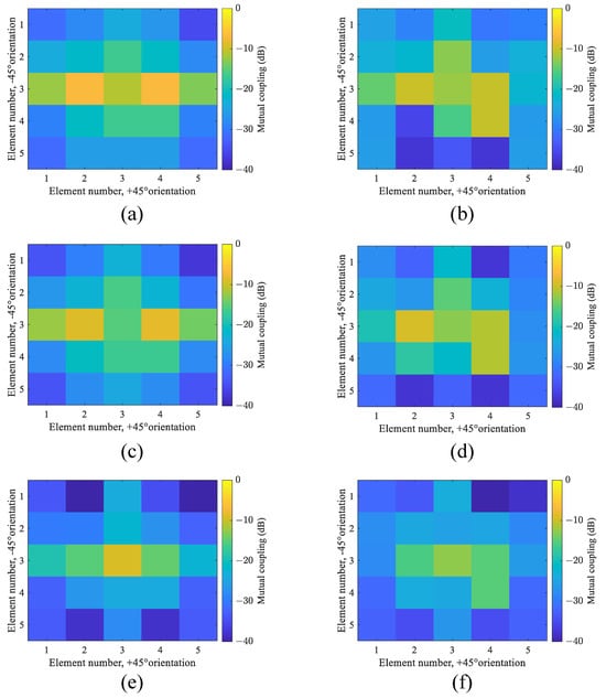 Comparison of mutual coupling between the center element and surrounding elements in the cylindrical array and the reference planar array at different frequencies. (a) Planar array at 3 GHz; (b) cylindrical array at 3 GHz; (c) planar array at 4 GHz; (d) cylindrical array at 4 GHz; (e) planar array—5.9 GHz; (f) cylindrical array at 5.9 GHz. The mutual coupling between the elements in the cylindrical array is based on the tightly coupled crossed disk elements.