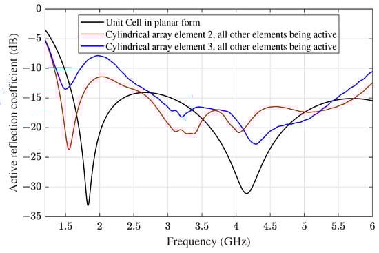 The active reflection coefficients of the center elements “2” and “3” in the cylindrical array, compared with the active reflection coefficient of the unit cell in an infinite reference planar array.