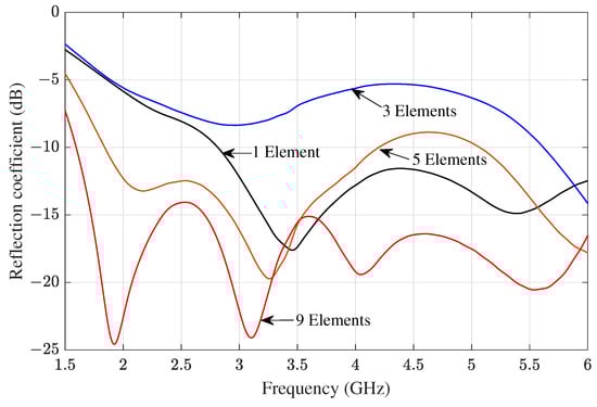 The active reflection coefficient for the subarrays consisting of a different number of active elements, where 1, 3, 5, or 9 elements became active simultaneously. The center element of the subarrays was observed in all scenarios.