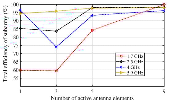 Total efficiency of the center element in the subarrays of different sizes, 1, 3, 5, and 9 elements in the subarrays, respectively. Far-field radiation patterns at 4 frequencies of 1.7 GHz, 2.5 GHz, 4 GHz, and 5.9 GHz were used for 4 different subarrays.