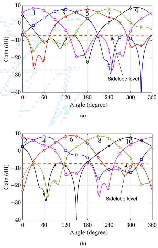 The 10 independent beams formed in the horizontal plane of the cylindrical array; each beam was formed with a subarray of 9 elements, which are distributed evenly around the cylinder. (a) The 5 beams in the horizontal plane with an odd number. (b) The 5 beams in the horizontal plane with an even number.