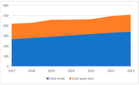 - 23 Email Spam Statistics to Know in 2023. Available online: https://www.mailmodo.com/guides/email-spam-statistics/ (accessed on 14 September 2023).
