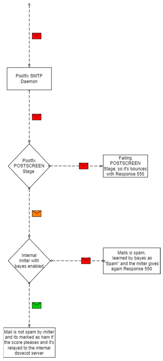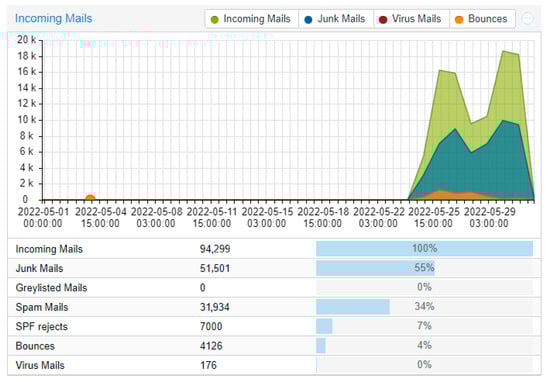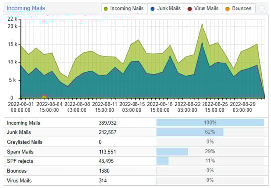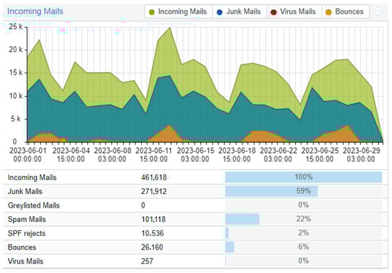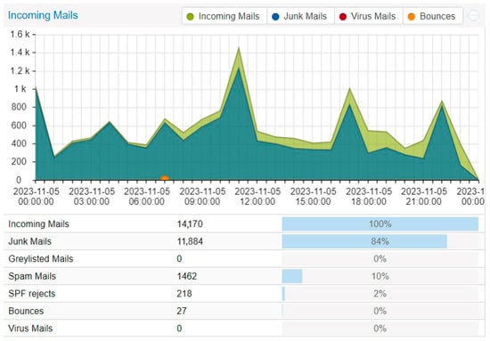 We installed and configured the servers in May 2022 (Figure 4). The data were collected over 1 year and 6 months (November 2023). We noticed that in our use case, implementation of Bayes did improve our mail filter.