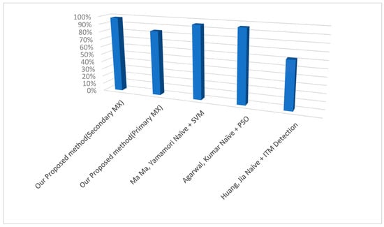 Our results show that our proposed method, compared to the other two methods, showed a similar performance, with around a 98% success rate in spam detection on the secondary MX server (which mostly receives spam emails) that uses the same Bayes data. We also compared our data to a similar approach that combines naïve Bayes and custom intelligent text modification detection on real internet email traffic, which was developed by Huang, Jia, Ingram, and Peng [19]. Per Figure 8, we see that our approach to real email traffic had a success rate of 84% compared to the aforementioned study’s 62%.