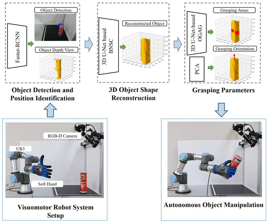 Figure 1 shows the visuomotor robot system and workflow of our autonomous object manipulation system. From the left, the motor components include a UR3 robot arm, the anthropomorphic soft robot hand (i.e., the qb Soft Hand), and a single vision sensor. The qb Soft Hand has 19 degrees of freedom (DoF) controlled with a single motor. The vision sensor is an Intel RealSense D415 RGB-D camera able to sense the color and depth information of an object at a minimum distance of 45 cm with a 2MP resolution. The vision intelligence based on DL is operated in three stages. First, Faster-RCNN detects the object. Its position is found in the working space. The RGB-D sensor captures a partial depth view of the objects. Second, our 3D U-Net-based BNSC reconstructs the complete 3D shape of the object from the partial depth view. Third, our 3D U-Net-based OGAG and PCA estimate the object manipulation parameters of position and orientation, respectively. Finally, the object is automatically grasped and relocated using the UR3 and qb Soft Hand system.