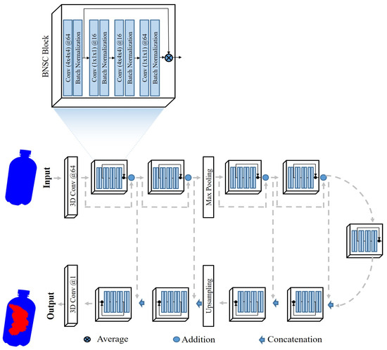 Each BNSC block is composed of four convolutional layers, including bottle-neck layers, as shown in Figure 2. The bottle-neck layers are convolutional layers with a kernel size 1 × 1 × 1 used to reduce or restore the feature maps [38,39]. The main advantage of bottle-neck layers is reducing the network size because of their 1 × 1 × 1 kernel. The first convolutional layer of the BNSC block extracts 64 features using a kernel size of 4 × 4 × 4. The second convolutional layer is a bottle-neck layer that reduces the number of features from @64 to @16. The third convolutional layer extracts 16 features using a kernel size of 4 × 4 × 4. At the output of the BNSC block, a bottle-neck layer restores the features from @16 to @64. Batch normalization is used after each convolutional layer.