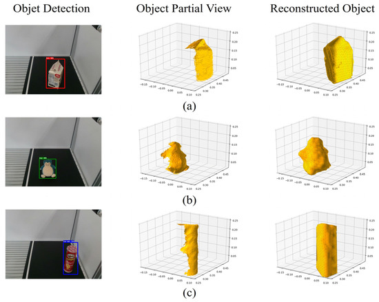 The object shape reconstructor is validated qualitatively using samples of some representative objects. Extensive quantitative validation of 3D U-Net-based BNSC is available in [22], where the Jaccard similarity index (i.e., Intersection over Union) was used to assess the reconstruction performance, achieving an average reconstruction performance of 72.17% with the ShapeNet database and 87.03 with the Grasp database. Figure 3 shows the detected objects, sensed partial view of each object, and the reconstructed objects via 3D U-Net-based BNSC. Figure 3 presents the identified objects in the first column, the corresponding sensed partial views in the second column, and the reconstructed objects in the third column. Figure 3a–c depict the reconstruction results for the milk box, toy, and Pringles can, respectively.