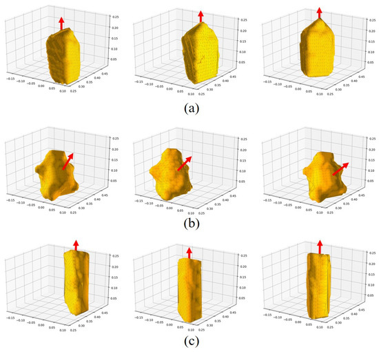 Figure 5 shows samples of the objects’ principal components for some representative objects. Figure 5a shows some reconstructed milk boxes and the direction of the principal component as a vector in red. Figure 5b and Figure 5c show the direction of the objects’ principal components for the reconstructed toy and Pringles can, respectively.
