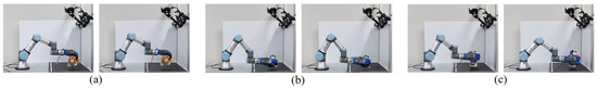 Our proposed autonomous object manipulation system is scalable to manipulate variously shaped objects because the continuous orientation angles (i.e., in the range of 0° to 90°) are calculated using PCA. The object manipulation results show the soft robot hand adopting an angle around 90° (for top grasping) to orientate the hand for grasping the tiger, as shown in Figure 6a. The soft hand rotates between 0° and 90° to grasp the toy according to the object shapes (in between top and lateral grasping), as shown in Figure 6b. The soft hand slightly rotates to manipulate the milk box, adopting an angle around 0° (for lateral grasping), as shown in Figure 6c.