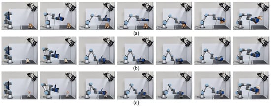 Time series frames of one grasping and relocating attempt by our autonomous object manipulation system for the tiger (a), toy (b), and milk box (c).