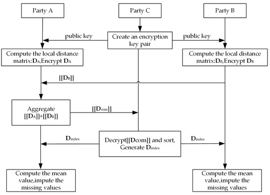 In order to ensure the confidentiality of the data, a trusted third-party collaborator C is introduced to coordinate the intermediate interaction results, and party C can be played by an authoritative organization such as the government or replaced by secure computing node such as Intel Software Guard Extensions [31]. The federated KNN imputation algorithm executes the following six steps: