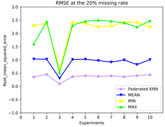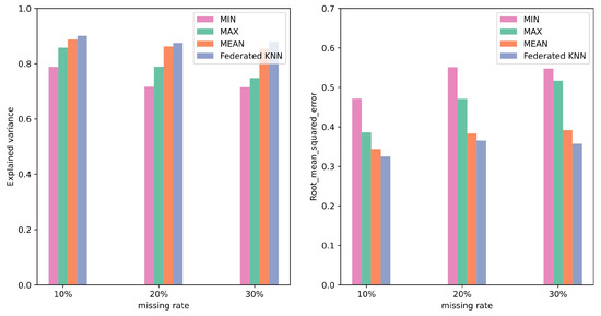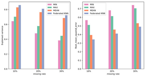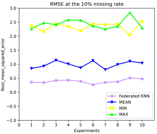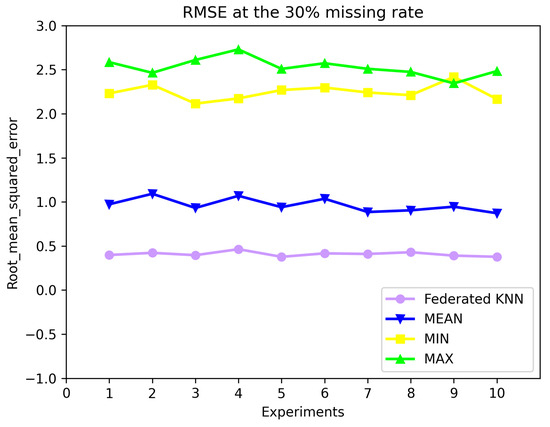 Overall, among the methods studied, the proposed federated KNN imputation method yields imputed values that are closer to the original distribution of the data. As more values are removed, the data matrix becomes sparser (i.e., fewer complete values are available for training), which in turn degrades interpolation performance. That is, all techniques tend to use denser data matrices to produce more accurate imputation, which is consistent with previous research [34]. Root mean squared error (RMSE) is selected as the performance metric to further compare the imputation effect of the proposed method with the other three methods. Each experiment is conducted 10 times, results are shown in Table 3 and displayed in Figure 5, Figure 6 and Figure 7.