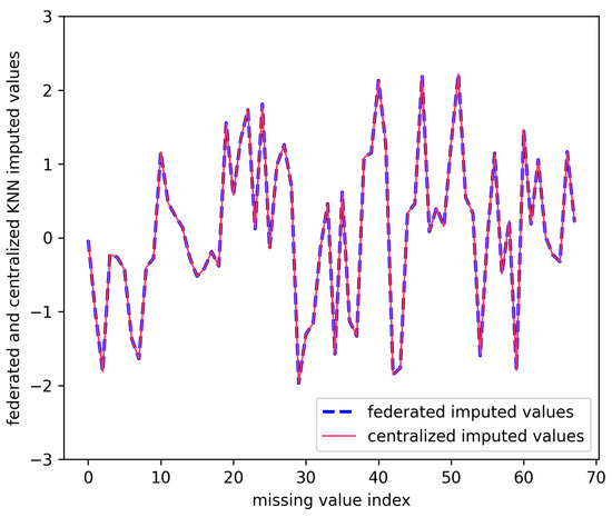 It can be seen from the Figure 9 that the federated KNN imputation results are completely consistent with the centralized KNN imputation results, indicating that the federated KNN imputation method can almost realize lossless federated imputation while protecting local data set.