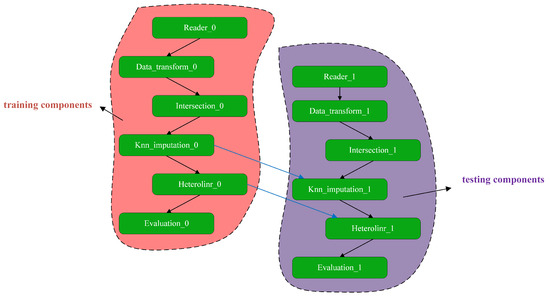 Both processes utilize the Reader component to read the data, and the processed data enters the DataTransform component for format conversion. After completing the data conversion, both sides’ data is intersected through the Intersection component to align the data samples based on the ID. The KnnImputation component is then employed to impute any missing values in the data. Following feature imputation, the HeteroLinR linear regression component is used for vertical federated regression modeling. Finally, the results are passed to the Evaluation component to compute the explainable variance and RMSE of the imputation. The experimental results are as follows.